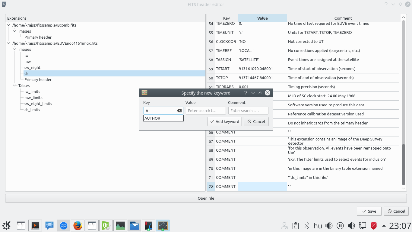 Currently you can open files, and for every file a nice tree is created, showing separately the Image and Table (ASCII table, binary table) extensions. In the table you can see the keywords of the currently selected header. I know the layout needs some improvements, soon that will be fixed too. It will be possible here to modify the entries, add new ones, or remove some. I've added some standard keywords from the FITS standard to be accessible from the "Key" KTextEdit. Adding a new keyword: